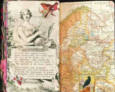 I've joined Mary Green's Collage Club and today I got my first email with a lesson and images to use. I am also working in my sketchbook project moleskine, working to finish it up and send it off to join the others on tour. So I combined the two projects and followed Mary's lesson while getting another spread done in my sketchbook.